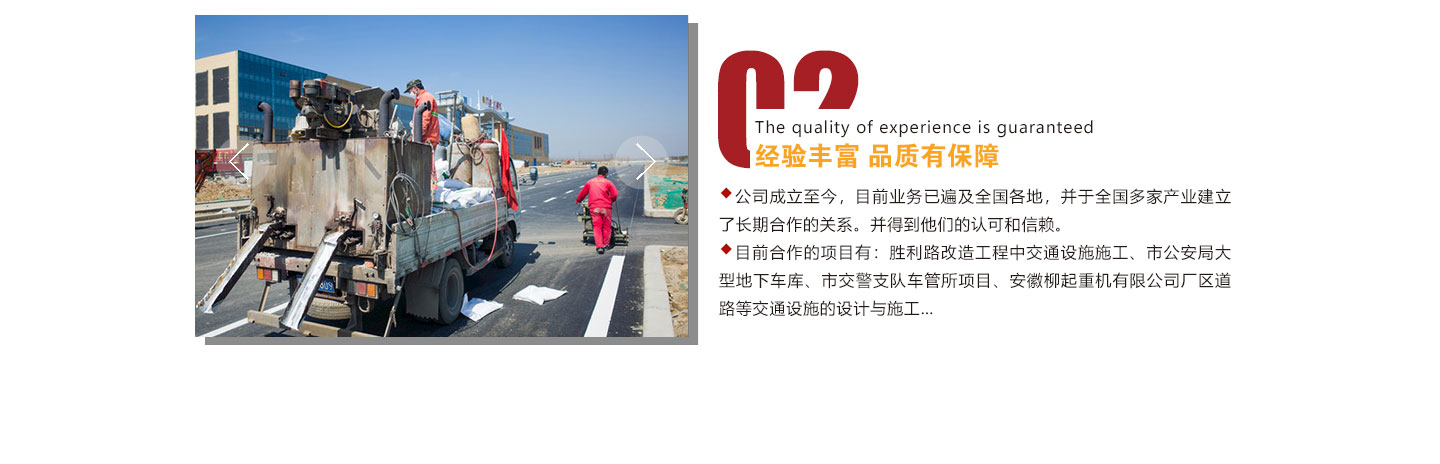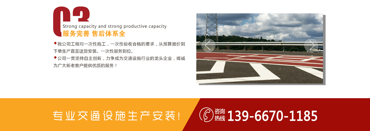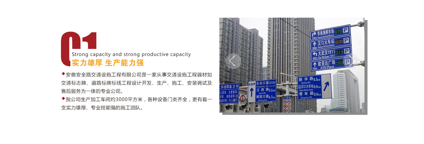 安徽安全路交通设施工程有限公司是一家从事交通设施工程器材(如交通标志牌/道路标牌标线工程)、休闲椅、耐磨地坪、环氧树脂地坪、停车场设施设计开发、生产、施工、安装调试及售后服务为一体的专业公司。公司主要产品有:橡胶减速带、交通路锥、护角、车位锁、警示柱、防撞桶、路障、道钉、广角镜、交通标牌等。公司始终以市场为导向,依靠良好的质量和信誉,赢得了国内外新老客户的一致好评。我们拥有规划人员和专业的施工队伍...
